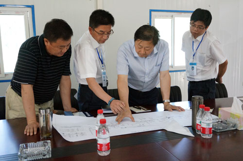 赵世运(右二)一行在查看施工总体平面图