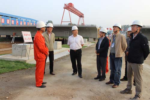 本网张家口讯 9月25日,局董事长、党委书记张河川一行莅临一公司张呼铁路怀安制梁场检查指导工作,并为“打造‘五型’梁场 建功张呼客专”活动揭牌,局副总经济师徐亦辉,张呼客专指挥长钱胜,公司党委副书记王宏铭等陪同。