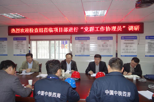 回到项目部驻地,何梦通一行展开党群工作协理员调研工作,听取项目书记对于党群协理员的汇报,还查看了项目部党群工作协理员文化室,并检查了项目部宣传栏“五保四创”宣传实施工作,对党群协理员公示牌、群安员公示牌、青安岗公示牌给予认可。何梦通认真阅读了项目部对于“项目部精细化管理”、“五保四创”及“党群协理员工作”深入贯彻落实的三本资料集,他说项目部党建工作开展基础结构扎实,特色鲜明,亮点突出,希望党建工作完善时,要及时结合施工生产,并起到促进作用;在做好党群协理员工作的基础上,下一步工作把协作队伍“五同管理”工作做实做细,取得看得见、听得见、摸得着的效果;要把握企业改革工作重点,及时转移对作业层队伍、协作队伍精细化管理工作;项目部党群协理员不要把工作单单定义在谈心、思想政治工作上,要切实转变角色,对自己进行改革,把工作革新到把协作队伍纳入到项目部制定的各项规章制度,实行目标制,任务分解制,提高协作队伍的综合素质,做好精细化管理制度的延展;做好改革工作的同时,要牢记股份公司、四局等各单位的先进经验、优良传统,把项目精细化管理革新任务和各单位传统理念融洽结合,融会贯通,承担起单位优良传统的传承工作。