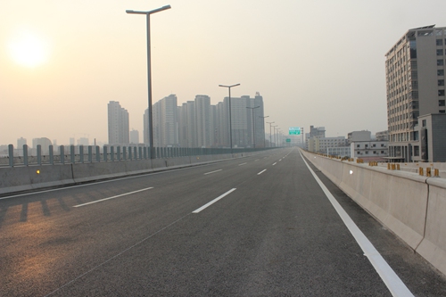 郑州市农业路快速通道工程规划为东西向城市快速通道,中铁四局一公司承建的第七标段,全长1.1275公里,主线高架桥为城市快速路,双向6车道;地面辅道为城市主干路,车道规模为双向8快2慢;桥梁基础设计为钻孔灌注桩,上部构造为现浇连续箱梁,共16联58跨。