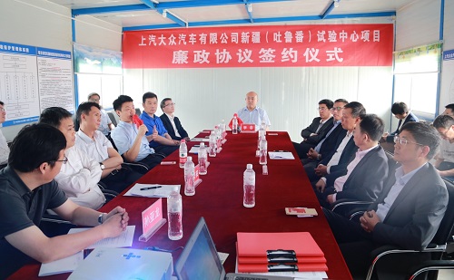 本网吐鲁番讯:5月18日上午,同为世界五百强企业旗下的上汽大众汽车有限公司和中铁四局、监理单位及设计单位,在上汽大众汽车新疆(吐鲁番)试验中心项目会议室举行了廉政协议签约仪式,上汽大众汽车有限公司纪委副书记孙国强、整车高级总监马扎根、新疆试车场高级经理李春、工厂规划高级经理施琦等相关领导,上海市政工程设计研究总院(集团)有限公司交通规划院院长王士林,上海建科咨询工程有限公司第三事业部总经理孙亚龙、项目总监钟海荣,中铁四局一公司执行董事、党委书记夏必安、纪委书记臧立新以及新疆(吐鲁番)试验中心项目相关人员参加了签约仪式。