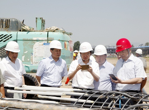 业主总经理马春山看到旋挖钻机采用了中铁四局自行研发的聚合物泥浆,向技术人员详细询问了施工工艺要点,并表示 四局大力推广新工艺,值得其他施工单位学习。已完工的100#墩身上的二维码还吸引了副总经理马明正的目光,他兴致勃勃地拿起手机扫码后,认真查阅了该部位的墩号、施工时间、养护状态等工程信息后,跟现场施工人员说道,像这样的信息化管理手段要全线推广。当嘉宾们看到规范存放的钢筋笼,对桩身主筋采用泡沫岩棉管包裹、在笼内安装临时加强撑给予了好评。王传霖和马春山不约而同地拿起了手机拍照后,称赞项目部现场施工中考虑的细致周到。