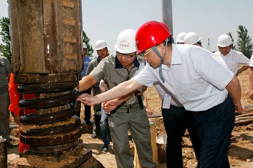 业主总经理马春山向现场施工技术人员详细询问四局自主研发的钻孔桩聚合物泥浆的施工要点